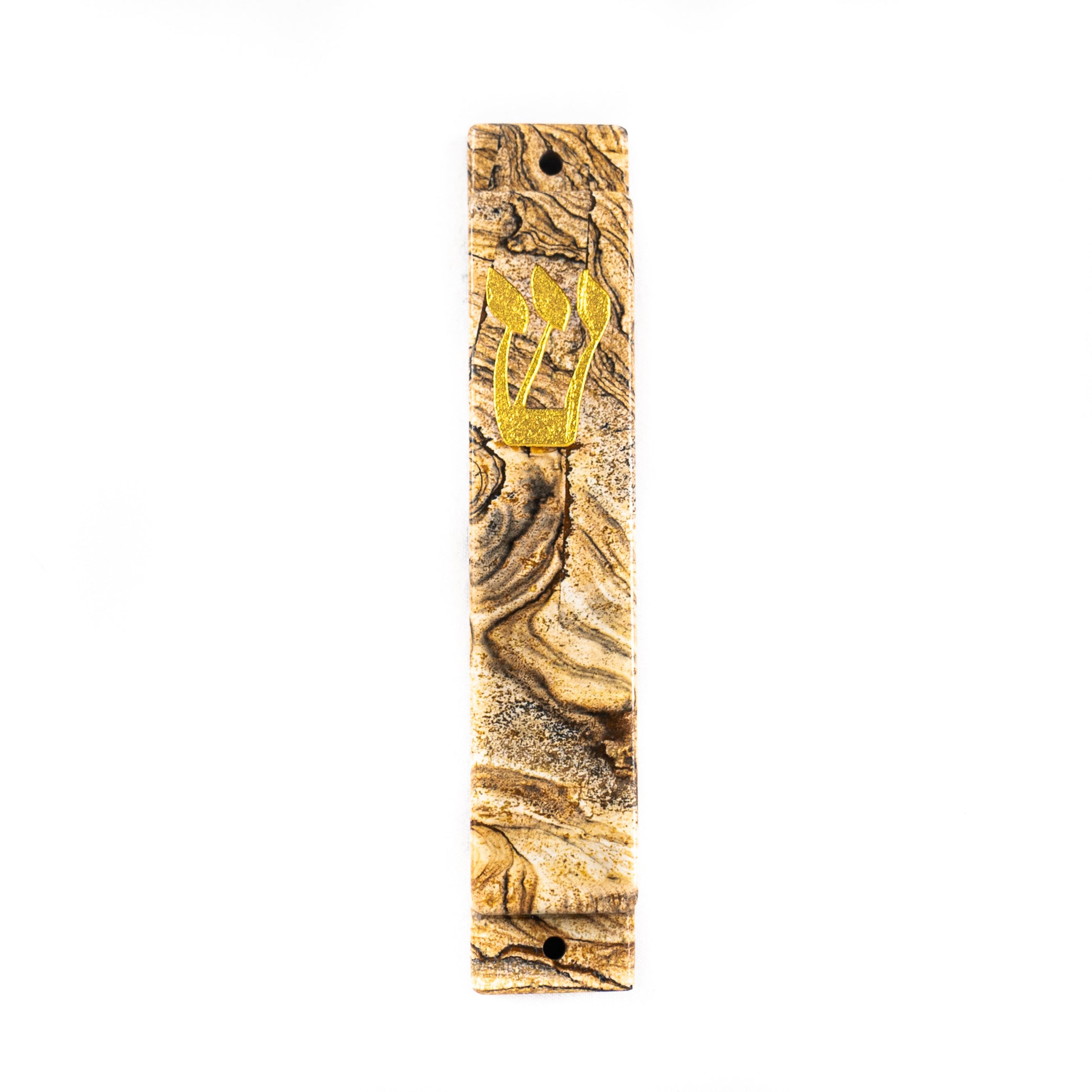 The handmade picture jasper stone Mezuzah case is perfect for the home. It is beautifully hand carved from one piece of picture jasper stone and etched in resin with a Shin (ש) and Star of David. The picture jasper is 100% pure stone so the color may vary slightly.